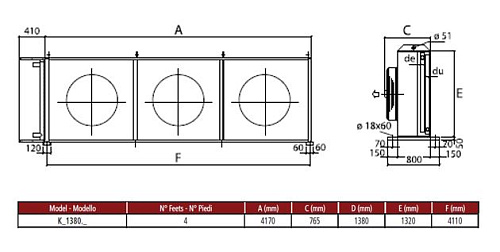 Конденсатор Thermokey серии R, модель KR 1380.BD H, предназначен для работы с хладагентом R404A; по методике EN 327 при перепаде температур 15 K холодопроизводительность составляет 125,8 кВт. Аэродинамическая характеристика обеспечивает расход воздуха порядка 27 600 м3/ч при использовании трёх вентиляторов диаметром 800 мм, акустический уровень на дистанции 10 м зафиксирован на уровне 34 dBA. Теплообменная площадь составляет 355 м2, объём трубного контура — 41 л; присоединительные патрубки рассчитаны на диаметры 54 мм (вход) и 42 мм (выход).