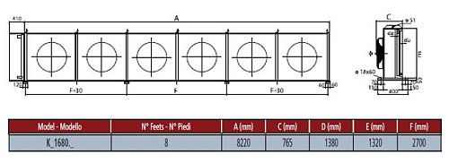 Конденсатор Thermokey серии R, модель KR 1680.CD H, рассчитан на работу с хладагентом R404A и обеспечивает теплопередачу по методике EN 327 при ∆T=15 K на уровне 273,7 кВт; воздухообмен через теплообменник при номинальном режиме составляет порядка 51 000 м3/ч, обеспечивается шестью осевыми вентиляторами диаметром 800 мм; внутренний объём трубной системы составляет 161 л, площадь поверхности теплообмена — 946 м², присоединительные патрубки имеют условные диаметры входа/выхода 76/42 мм, уровень звукового давления на расстоянии 10 м — 37 dBA.