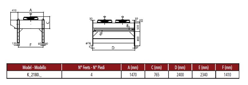 Конденсатор выполнен в конфигурации с вертикальным направлениям воздушного потока и двухвентиляторной компоновкой: два вентилятора диаметром 800 мм формируют поток через оребрённый теплообменник; гидравлические подключения выполнены в двухканальной схеме с парой входных и выходных патрубков 2×35 мм и 2×22 мм, что обеспечивает удобство интеграции в многоконтурные холодильные установки.