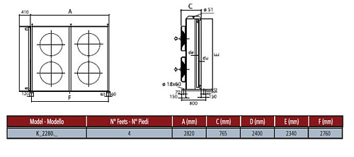 Агрегат выполнен в горизонтальном исполнении воздушного потока (маркировка H) и оснащён четырьмя осевыми вентиляторами диаметром 800 мм, обеспечивающими принудительную продувку теплообменного блока; для подключения к холодильной магистрали предусмотрены по два патрубка входа диаметром 35 мм и выхода диаметром 28 мм, что обеспечивает разделение потоков и удобство монтажа в составе выносной конденсаторной установки.