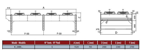 Конструкция выполнена в конфигурации выносного конденсатора с вертикальным направлением воздушного потока и оснащена восемью осевыми вентиляторами диаметром 800 мм, что обеспечивает прохождение большого объёма воздуха через теплообменный блок; фланцевые патрубки входа и выхода хладагента имеют диаметры, соответствующие присоединениям 2×42 мм и 2×35 мм, что обеспечивает подключение к магистралям среднего диаметра в промышленных холодильных системах.