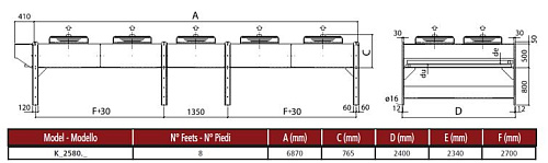 Аппарат выполнен для вертикального воздушного потока: вентиляторы расположены над теплообменной батареей для направленного отбора и выброса воздуха, что обеспечивает равномерную продувку теплообменной поверхности. Конструкция рассчитана на выносное размещение в составе холодильной установки с удобной компоновкой патрубков для подключения линий хладагента и проведения регламентного обслуживания.