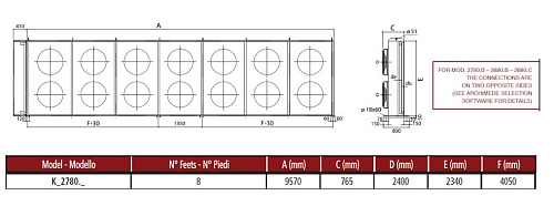Конструкция выполнена в горизонтальном варианте воздушного потока: обдув обеспечивается массивом из четырнадцати осевых вентиляторов диаметром 800 мм, собранных в конфигурацию, соответствующую исполнению EN 327 14×800 мм. Аппарат спроектирован как выносной конденсатор с возможностью организации нескольких гидравлических контуров за счёт парных входных и выходных соединений, что облегчает интеграцию в многоконтурные холодильные установки.