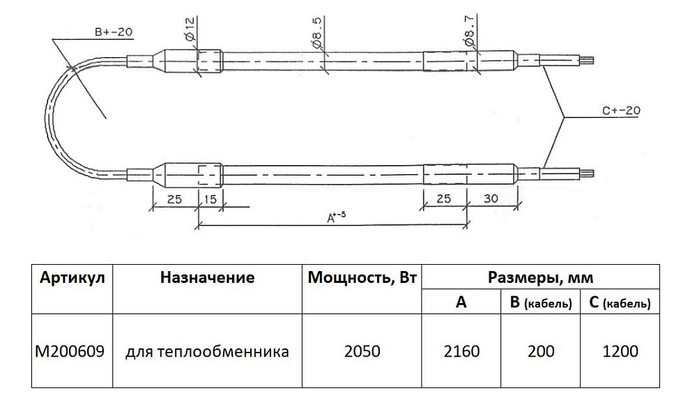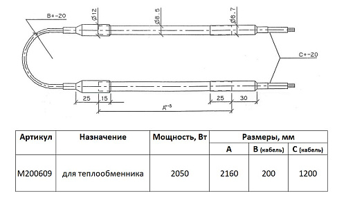 Трубчатый электрический нагревательный элемент ThermoKey M200609 предназначен для периодической оттайки наледи в теплообменных узлах холодильного оборудования; номинальная тепловая мощность порядка 2,05 кВт, общая длина нагревательной секции составляет примерно 2,16 м при внешнем диаметре оболочки 8,5 мм, что определяет параметры плотности тепловыделения и требования к способу монтажа.