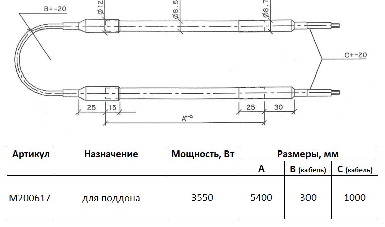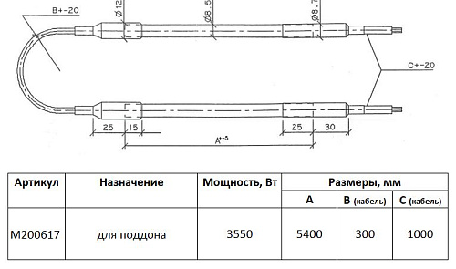 Трубчатый электронагреватель выполнен как протяжённый нагревательный элемент цилиндрического сечения и обеспечивает рабочую тепловую нагрузку порядка 3,55 кВт; при общей протяжённости более пяти метров геометрия элемента рассчитана на равномерное распределение теплового потока вдоль поддона воздухоохладителя, а малый диаметр обеспечивает компактное размещение в канале поддона.