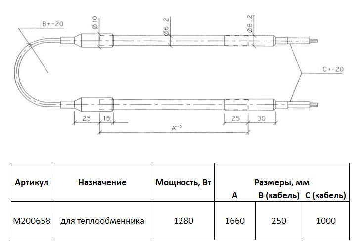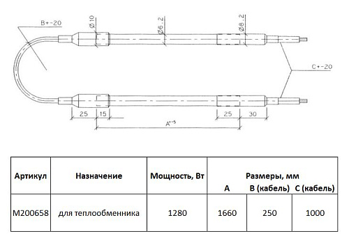 ТЭН теплообменника ThermoKey M200658 (1,28 кВт, 1660 мм, 6,2 мм)