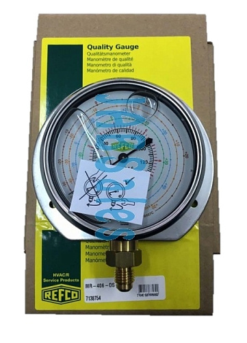 Манометр MR-406-DS-MULTI (бренд RefComp, изготовитель Refco) предназначен для измерения низкого давления в диапазоне от −1 до +10 бар; показания выводятся на круглый циферблат диаметром 80 мм с шагом деления 0,2 бар и классом точности 1,6, при этом на шкале нанесены температурные эквиваленты для хладагентов R22, R134a, R404A и R407C; присоединение к системе выполняется через стандартную резьбу M1/4" SAE, а конструкция обеспечивает степень защиты IP65.