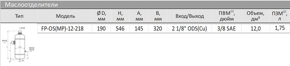 Маслоотделитель FP-OS(MP)-12-218 производства Frigopoint рассчитан на внутренний объем порядка 12,0 дм3 и поставляется с заводской предварительной заправкой маслом объёмом 1,75 л; максимальное допустимое рабочее давление корпуса составляет 45 бар. Подключение маслопроводов предусмотрено через штуцер с 3/8" SAE flare, для пайки выполнено отверстие под ODS Ø 2 1/8".