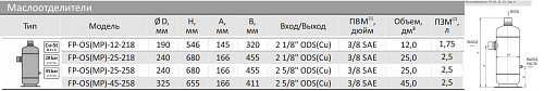 Маслоотделитель FP-OS(MP)-25-218 имеет рабочий внутренний объём порядка 25,0 дм3 и рассчитан на накопление и возврат масла в картер компрессора, при этом допускает предварительную заправку корпуса в объёме 2,5 л. Конструктивно устройство рассчитано на эксплуатацию при максимальном рабочем давлении до 45 бар и обеспечивает отделение масла от хладагента с эффективностью более 90 %, что снижает избыточную циркуляцию масла в холодоагентной магистрали.