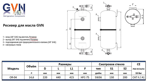 Ресивер для масла OR-04 GVN предназначен для аккумулирования и временного хранения рабочей смазки в масляных контурах, имеет номинальную вместимость масляной камеры 14,6 литра и разработан с учётом эксплуатации в диапазоне температур от −10 до +130 °C при максимальном рабочем давлении до 33 бар; изделие выпускается под брендом GVN.