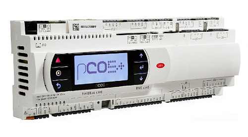 Микропроцессорный контроллер семейства pCO5+ обеспечивает управление холодильными и климатическими системами с поддержкой аппаратной и программной совместимости с предыдущими контроллерами pCO3. Встроенный дисплей обеспечивает локальный просмотр параметров и базовую настройку, на борту реализован встроенный привод EVD EVO для управления двумя универсальными электронными расширительными клапанами (2 univ. EXV). Для сервисного доступа предусмотрен USB-интерфейс и встроенный разъём программатора PGD1.