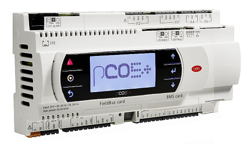 Контроллер выполнен в компактном исполнении семейства pCO5+ с микропроцессорным «NEW CORE», предусмотрен для монтажа на DIN-рейку в шкафах автоматики; на лицевой панели размещён дисплей для вывода состояния и локальной параметризации. В составе коммуникационных интерфейсов реализованы BMS-порт без оптопары, порт FB для полевого уровня, встроенный PGD1 для программирования и диагностики, а также нативный USB-интерфейс для сервисного доступа и обновления ПО.