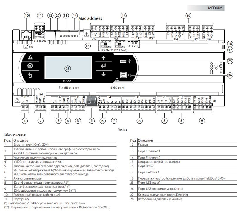 Программируемый контроллер CAREL серии c.pCO в средним форм-факторе представляет собой микропроцессорное устройство с многозадачной операционной системой; аппаратная конфигурация включает один Ethernet-порт, USB-интерфейс и встроенный сервисный интерфейс PGD1, а также порт FB/BMS без оптической развязки для интеграции с системами автоматизации.