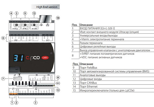 Контроллер серии c.pCOmini в исполнении high-end рассчитан на питание в диапазоне 24 Vac или 28–36 Vdc и предназначен для установки на DIN-рейку с занимаемым на рейке модульным габаритом, эквивалентным четырём модулям. В базовой конфигурации устройство поставляется с набором универсальных входов/выходов, позволяющим организовать первичный сбор сигналов и управление, с возможностью расширения функционала установкой дополнительной платы c.pCOe.