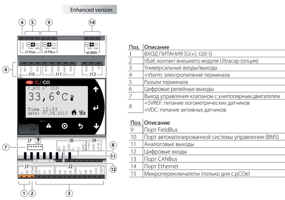 В контроллере реализованы технологии твердотельной коммутации и встроенное управление электронными расширительными клапанами, а также коммуникационные интерфейсы для интеграции в систему управления зданием (BMS) и для полевой шины (FB); предусмотрена возможность расширения функционала путем установки дополнительной платы расширения серии c.pCOe.
