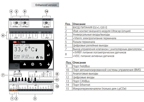Контроллер серии c.pCOmini (типоразмер enhanced) предназначен для управления холодильными и климатическими установками и рассчитан на питание 24 Vac или 28–36 Vdc; на базовой конфигурации обеспечивает 10 универсальных входов/выходов и содержит два твердотельных реле на 24 В для коммутации исполнительных элементов.
