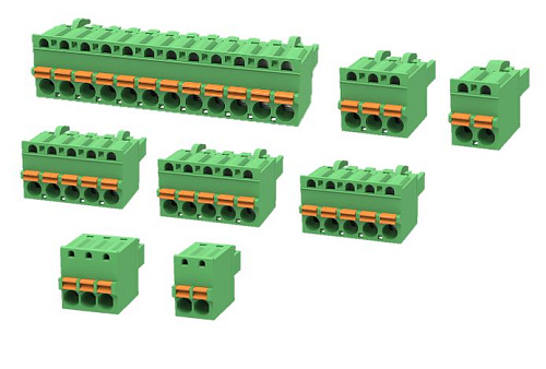Конструктивно клеммный блок выполнен в компактном модульном исполнении для монтажа на плату расширения, пружинные зажимы реализуют удержание жилы без использования винтового крепления, что обеспечивает упорядоченное размещение проводов и облегчает выполнение монтажных и сервисных операций на плате.