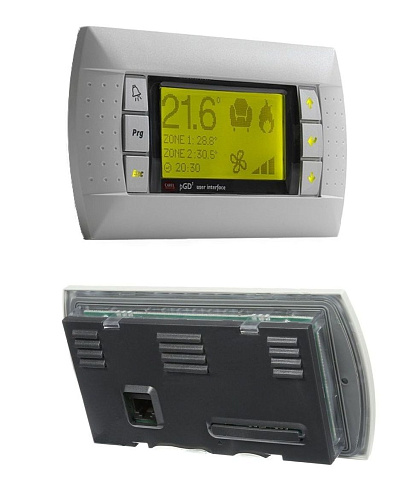 Конструкция дисплея предназначена для интеграции во встраиваемые панели, что упрощает монтаж и способствует экономии пространства. Отсутствие рамки придает устройству современный и компактный вид, что особенно актуально для новых проектов и модернизации существующих систем. Подключение устройства к контроллеру осуществляется по сети RS485, работающей по протоколу pLAN, что обеспечивает надежную связь с другими компонентами системы. Кнопки дисплея снабжены символами, дублируемыми на экране, что делает работу с интерфейсом интуитивно понятной.