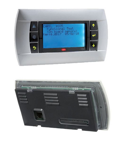 Графический дисплей с разрешением 132×64 точек, разработанный компанией CAREL и относящийся к семейству pGDne, обеспечивает отображение параметров и статусов системы с возможностью визуализации цифровых и символьных сообщений; модуль имеет встроенный звуковой оповещатель для формирования акустических сигналов аварий и предупреждений.