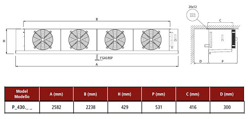Воздухоохладитель Thermokey Light Cubic PL 430.86 E обеспечивает холодопроизводительность до 8,0 кВт при использовании хладагента R404a в режимах SC3 (-25/∆7). При этом, в режиме SC2 (-8/∆8) его мощность достигает 10,4 кВт. Устройство оснащено четырьмя вентиляторами диаметром 300 мм, обеспечивающими воздушный поток до 6 360 м³/час и выброс струи до 11 метров при шаге ребра 8 мм. Оттайка осуществляется при мощности 6,43 кВт.