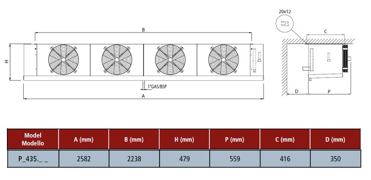 Воздухоохладитель Thermokey Light Cubic, мощностью охлаждения 10,6 кВт при использовании хладагента R404a, рассчитан на эксплуатацию в условиях SC3 (-25/∆7). Оборудование оснащено четырьмя вентиляторами диаметром 350 мм, общим расходом воздуха 10 610 м³/час, что обеспечивает равномерное распределение охлаждённого воздуха в пространстве. Холодопроизводительность при других температурных условиях составляет 13,7 кВт в SC2 (-8 / ∆8), что позволяет устройству эффективно работать в различных температурных режимах.