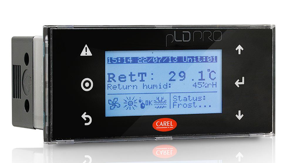 Конструкция терминала включает шесть кнопок для навигации и встроенный зуммер для звуковых оповещений, что способствует удобству управления и аудиогощению пользователю о различных событиях. Терминал совместим с контроллерами pCO и подключается через сеть RS485, работающую по протоколу pLAN.