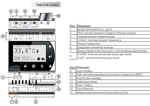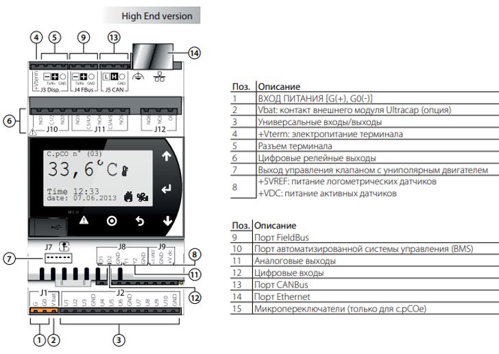Конструкция устройства выполнена в форм-факторе для щитовой монтажа: фронтальная панель содержит дисплей и средства локального управления, коммуникационные разъёмы и интерфейсные клеммы выведены на торец корпуса для удобства подключения в шкафу. На плате предусмотрены места для интеграции привода ЭРВ и для размещения твердотельных реле, при необходимости функционал ввода/вывода можно расширить установкой дополнительной платы c.pCOe.