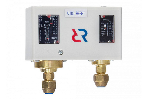 Конструктивно изделие объединяет два реле давления в одном корпусе, что обеспечивает разделённую защиту по низкому и высокому давлению при компактном монтаже; сдвоенное исполнение упрощает интеграцию в управленческие и защитные схемы холодильного агрегата и снижает количество точек крепления и трубопроводных подключений по сравнению с отдельными устройствами.