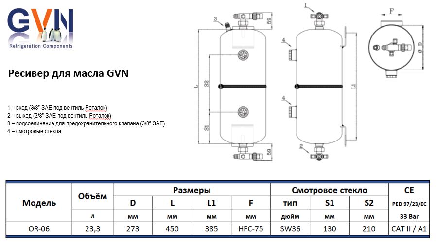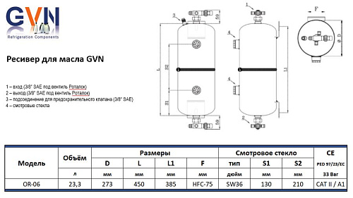 Ресивер для масла OR-06 GVN рассчитан на аккумулирование масла объёмом 23,3 л и эксплуатацию в температурном диапазоне от −10 до +130 °C; максимально допустимое рабочее давление составляет 33 бар, что определяет требования к прочности и герметичности соединений при встраивании в маслосистему.