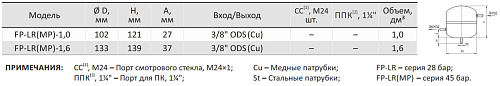 Вертикальный ресивер Frigopoint FP-LR(MP)-1,6 представляет собой жидкостную ёмкость объёмом 1,6 дм3, рассчитанную на максимально допустимое рабочее давление 45 бар; назначение — накопление и выдача жидкого хладагента в магистраль системы охлаждения для выравнивания подачи в испарители и формирования запаса хладагента.