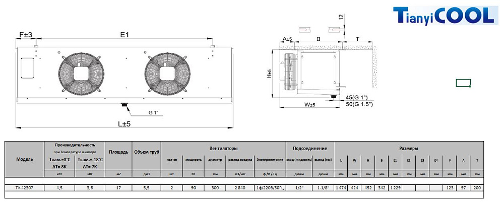 Воздухоохладитель T-COOL TA-42307 от TianyiCool предназначен для использования в малых и средних холодильных камерах. Обладая мощностью 4,5 кВт при температурных условиях SC2 (-8 / dt8) и 3,6 кВт при SC3 (-25/dt7) с применением хладагента R404a, данный воздухохладитель обеспечивает эффективное охлаждение свежих и замороженных продуктов. Размещение двух вентиляторов диаметром 300 мм позволяет достичь расхода воздуха 2840 м³/час и выброса струи до 8 метров.