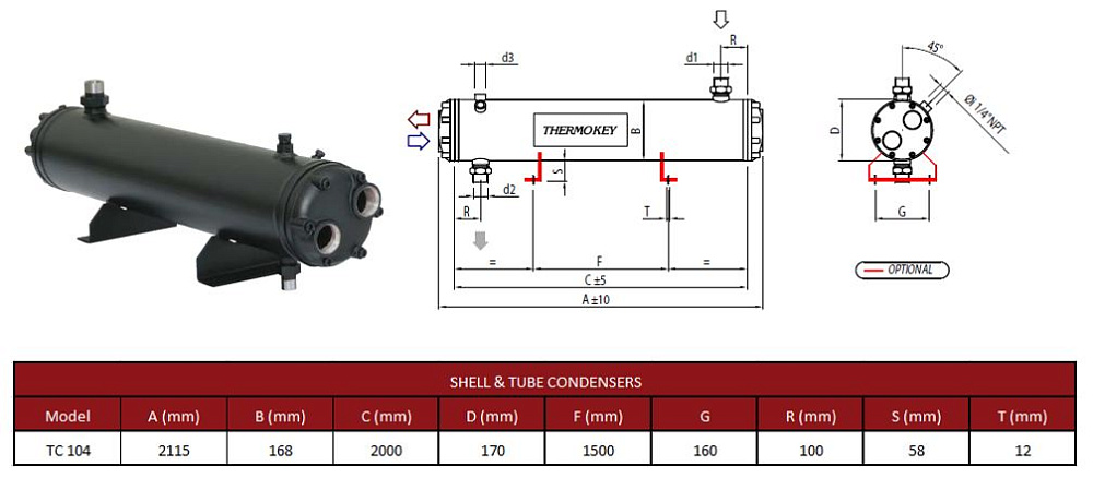 Конденсатор кожухотрубный Thermokey серии «TC» 104 кВт, R407c, Tk=+33.5 , Tw +15 / +30, TC 104