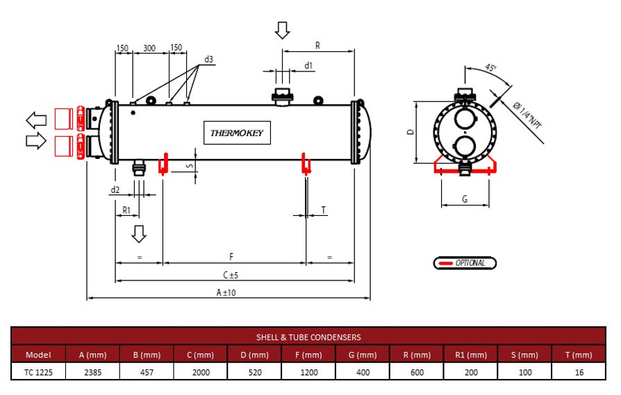 Кожухотрубный конденсатор Thermokey серии TC, модель TC 1225, рассчитан на работу с хладагентом R407C; номинальная теплопроизводительность при температуре конденсации +33,5 °C и температурном режиме теплоносителя +15/+30 °C составляет 1 225 кВт. При номинальной нагрузке устройство требует подачи охлаждающей воды около 70,5 м³/ч, внутренние объёмы теплоносителя и воды составляют соответственно 170 дм³ и 138 дм³, расчётное падение давления при протоке — 40,1 кПа. Патрубки хладагента выполнены с наружными диаметрами подключения OD114,3 (вход) и OD76,1 (выход).