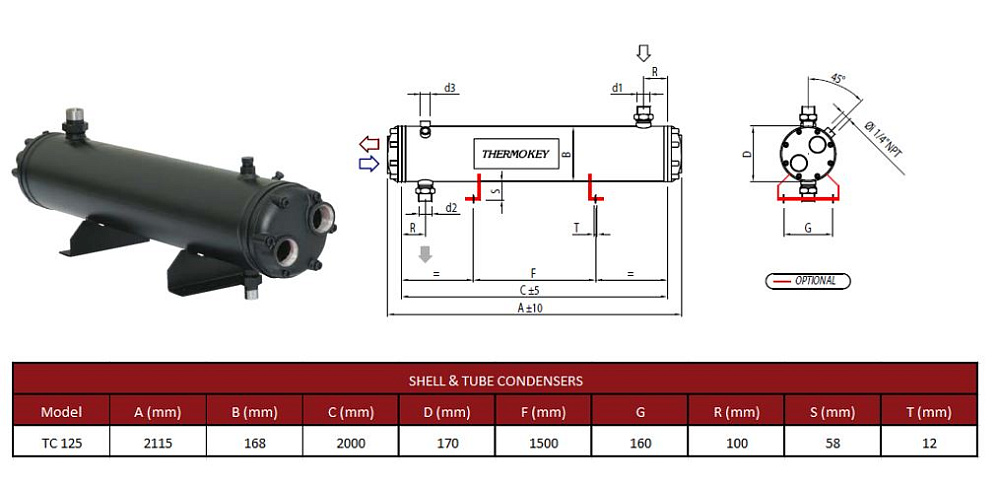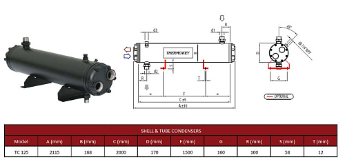 Конденсатор кожухотрубный Thermokey серии «TC» 125 кВт, R407c, Tk=+33.5 , Tw +15 / +30, TC 125