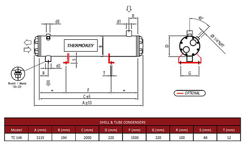 Конденсатор кожухотрубный Thermokey серии «TC» 146 кВт, R407c, Tk=+33.5 , Tw +15 / +30, TC 146