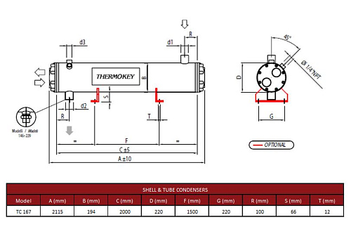 Кожухотрубный конденсатор Thermokey серии TC рассчитан на отвод тепла порядка 167 кВт при работе на хладагенте R407C с расчетной температурой конденсации около +33,5 °C и режимом теплообмена с проточной водой при температурах порядка +15/+30 °C. Гидравлические параметры включают расход охлаждающей воды порядка 9,6 м3/ч и внутренний объём воды порядка 15,1 л; объём хладагента в корпусе составляет приблизительно 35,3 л. Конструктивно выполнен по четырёхходовой схеме с ожидаемыми потерями давления на стороне хладагента около 36 кПа; присоединения хладагента предусмотрены в исполнениях ODS42 и ODS35 с указанным адаптером RTLK 1-3.4".