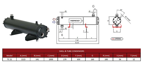 Конденсатор кожухотрубный Thermokey серии «TC» 21 кВт, R407c, Tk=+33.5 , Tw +15 / +30, TC 21
