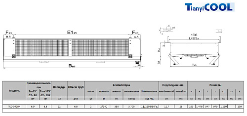 Воздухоохладитель потолочный T-COOL TED-042BN, 7 мм, 2*350мм, 6.0/4.7 кВт (SC2/SC3), электрооттайка