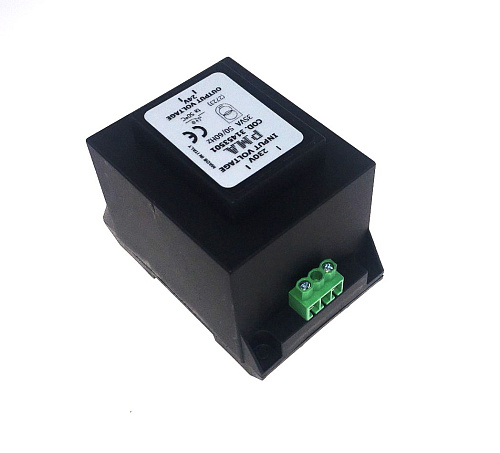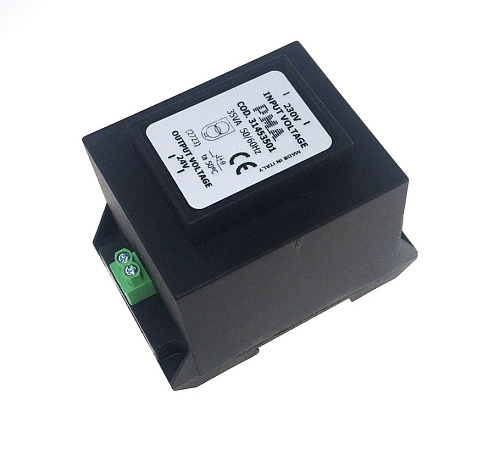Трансформатор предназначен для преобразования сетевого переменного напряжения 230 В в низковольтный переменный выход 24 В с номинальной нагрузочной способностью 35 В·А, что позволяет подключать типовые цепи управления и исполнительные элементы в системах автоматики.