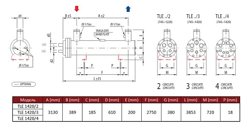 Испаритель Thermokey серии TLE 1420/2 представляет собой кожухотрубный теплообменник с номинальной холодопроизводительностью 1 420 кВт, указанной для условий T0=+2 и Tw=+12/+7 при использовании хладагента R407C; в наименовании также указан вариант с R134a и ориентировочное рабочее состояние T0=+3. Конструктивные гидравлические параметры включают объём межтрубного пространства для воды 583 дм3, объём хладагента 376 дм3, проектный расход воды порядка 243,74 м3/ч и перепад давления порядка 75,2 кПа при расчётных условиях.