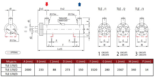 Кожухотрубный испаритель Thermokey серии TLE, модель TLE 170/1, рассчитан на тепловую нагрузку порядка 170 кВт; приведённое значение измерено по методике, указанной для R407C при условиях T0=+2 °C и температурах воды на входе/выходе Tw=+12/+7 °C, в обозначении также фигурирует вариант работы с R134a при T0=+3 °C. Объём межтрубного пространства для теплоносителя составляет примерно 85 литров, объём хладагента в трубном пучке — порядка 35 литров; при расчётном тепловом режиме требуемый расход воды составляет около 29,18 м3/ч.