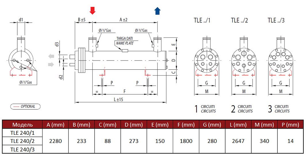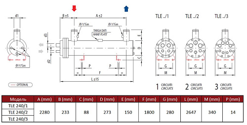 Испаритель кожухотрубный Thermokey серии TLE (модель TLE 240/3) рассчитан на работу с хладагентом R134a при температуре испарения T0 = +3 °C и теплоносителе с температурной парой вход/выход +12/+7 °C; при сертификационных условиях по R407C (T0 = +2 °C, dt = 5 °C, Tw = +12/+7 °C) прибор обеспечивает холодопроизводительность 240 кВт. Гидравлические характеристики включают расход охлаждающей воды 41,2 м3/ч и потери давления в теплообменнике порядка 29,8 кПа; внутренние емкости составляют 88 дм3 по воде и 45 дм3 по хладагенту, что влияет на требования к дозаправке и времени уравновешивания теплоемкости системы. Патрубки хладагента выполнены диаметром вход/выход 35/54 мм и предназначены для подключения к наружным холодильным агрегатам и трубопроводам соответствующих диаметров.