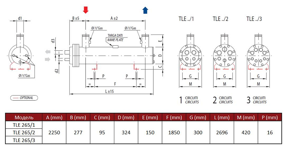 Испаритель кожухотрубный Thermokey серии TLE, типоразмер TLE 265/2, имеет паспортную холодопроизводительность 265 кВт (значение приведено для хладагента R407C при температуре кипения T0=+2 °C и температуре воды Tw = +12/+7 °C); в обозначении модели также указан вариант для хладагента R134a с рабочей точкой T0=+3 °C. Объём межтрубного пространства по воде составляет 133 дм3, объём хладагента в аппарате — 56 дм3, расчётный расход воды через испаритель — 45,49 м3/ч, потери давления теплоносителя по ходу через аппарат — 24,3 кПа. Патрубки хладагента для подключения входа и выхода выполнены с присоединительными размерами 28 и 89 (соответственно), конструктивно реализованы два независимых холодильных контура.