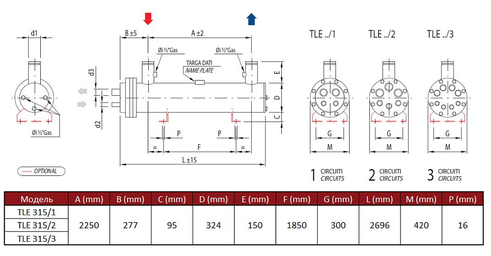 Испаритель кожухотрубный Thermokey TLE 315/2 рассчитан на холодопроизводительность порядка 315 кВт в эталонном режиме; в обозначении аппарата указаны рабочие температурные параметры T0≈+3 °C и температурный перепад теплоносителя по ходу +12/+7 °C. При расчёте и приведённых характеристиках использована методика, сопоставимая с данными для хладагента R407C (эталонный режим T0=+2 °C, Tw +12/+7 °C). Объём межтрубного пространства для воды составляет 128 дм3, объём хладагента в трубном пучке – 61 дм3, пропускная способность по воде обеспечивает расход порядка 54,07 м3/ч, а прогнозируемые потери давления по хладагенту в пучке составляют примерно 31,6 кПа. Патрубки хладагента выполнены диаметрами вход/выход 28/89 мм, что определяет требования к присоединительным магистралям.