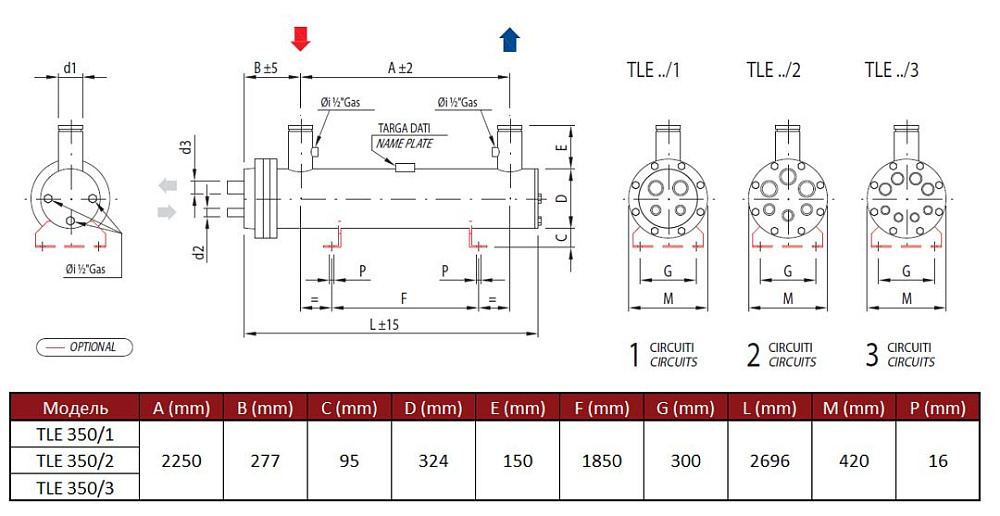 Испаритель кожухотрубный Thermokey серии TLE, модель 350/1, рассчитан на холодопроизводительность порядка 350 кВт при типовых условиях испытаний: в паспорте указаны параметры для хладагента R407C при температуре испарения T0 = +2 °C и температуре воды на входе/выходе теплообменника примерно +12/+7 °C; в наименовании модели также присутствует исполнение для работы с R134a при температуре кипения около +3 °C. Гидравлическая ёмкость по воде составляет 117 дм3, расход теплообменной воды порядка 60,08 м3/ч, объём хладагента в конструкции — 70 дм3; потери давления на испарителе по хладагенту заявлены на уровне 25 кПа, что влияет на подбор компрессорной части и регулирующие органы. Патрубки хладагента исполнены с диаметрами вход/выход 42/105, что определяет требования к монтажным линиям и фитингам.
