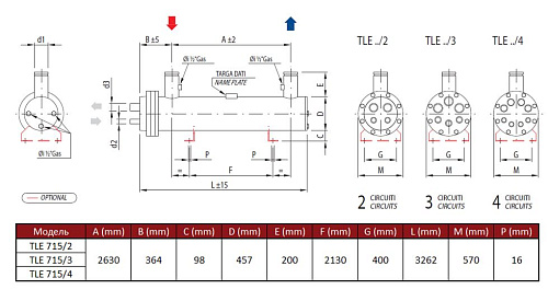 Кожухотрубный испаритель Thermokey TLE 715/3 рассчитан на работу с хладагентом R134a; в технических данных также приведена холодопроизводительность 715 кВт для условий расчёта с R407C при температуре кипения около +2 °C и температуре воды на входе/выходе +12/+7 °C. Гидравлические параметры включают расход воды порядка 122,73 м3/ч и запас воды в корпусе 288 дм3, объём фреоновой части составляет 170 дм3, а потери давления по теплообменнику — 49,8 кПа; фреоновые патрубки выполнены в диаметрах вход/выход 35/89 мм.