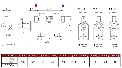 Испаритель кожухотрубный Thermokey серии TLE предназначен для работы в системах центрального охлаждения с расчетными температурными режимами испарения и подачи воды: в обозначении модели задан хладагент R134a и температурный уровень испарения около +3 °C при подаче/возврате воды около +12/+7 °C; эталонная холодопроизводительность по результатам типовых испытаний составляет 745 кВт (указана также характеристика для R407C при T0=+2 °C, Tw +12/+7 °C). Гидравлические параметры включают расход воды 127,8 м3/ч и объем межтрубного пространства по воде 500 дм3, перепад давления на теплообменнике порядка 36 кПа; объем заправки хладагентом составляет 173 дм3, подводы хладагента выполнены с условными проходами вход/выход 42/105 мм.