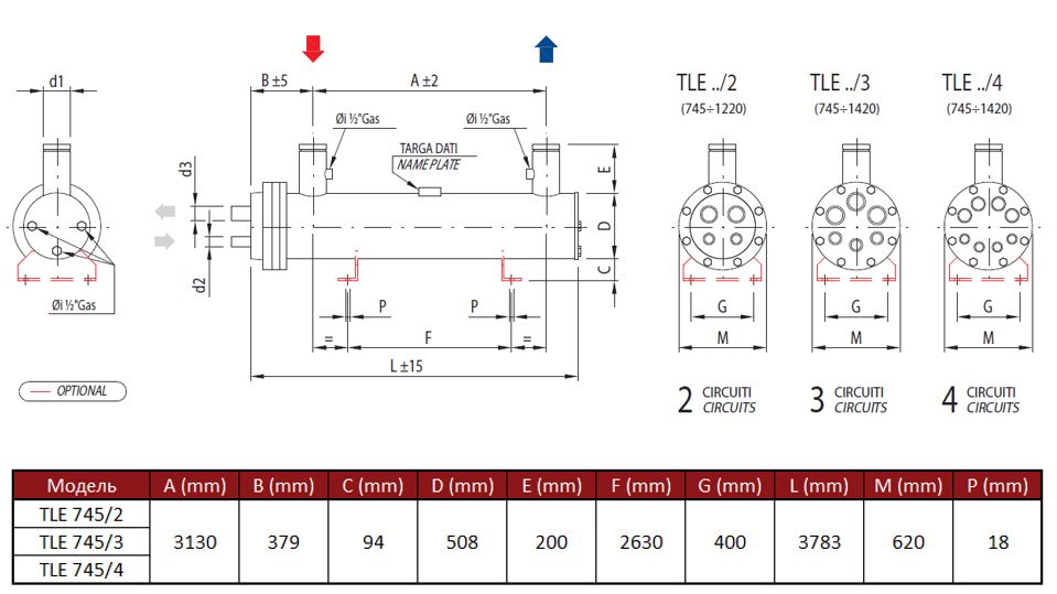 Кожухотрубный испаритель Thermokey TLE 745/4 предназначен для работы с хладагентом R134a с номинальной холодопроизводительностью порядка 745 кВт; в паспорте приводится эквивалентное значение 745 кВт при испытательных условиях для R407C (T0 = +2 °C, Δt = 5 K, Tw = +12/+7 °C), в наименовании указаны рабочие температурные параметры T0 = +3 °C и Tw = +12/+7 °C. Внутренний объём воды в аппарате составляет 500 дм3 при расчётном расходе водного теплоносителя 127,8 м3/ч; объём хладагента в теплообменнике — 173 дм3. Паспортное гидравлическое сопротивление при рабочем режиме составляет 36 кПа, что необходимо учитывать при подборе циркуляционного оборудования; присоединительные патрубки хладагента выполнены диаметрами 35 мм (вход) и 89 мм (выход).