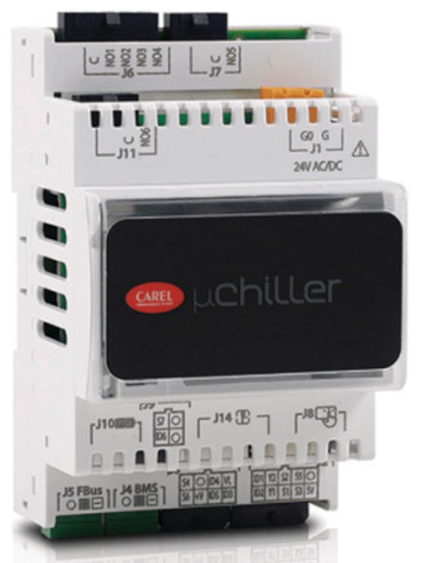 Контроллер μChiller семейства UCHILLER производства Carel предназначен для организации управления тепловыми насосами, холодильными машинами с воздушным и водяным охлаждением, а также отдельными конденсаторными установками; аппарат реализует полный набор функций управления и контроля технологических параметров холодильного контура в составе комплекта систем охлаждения.